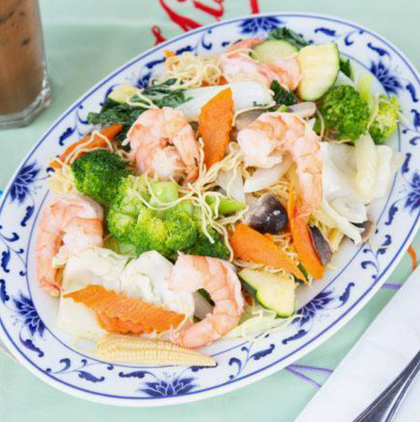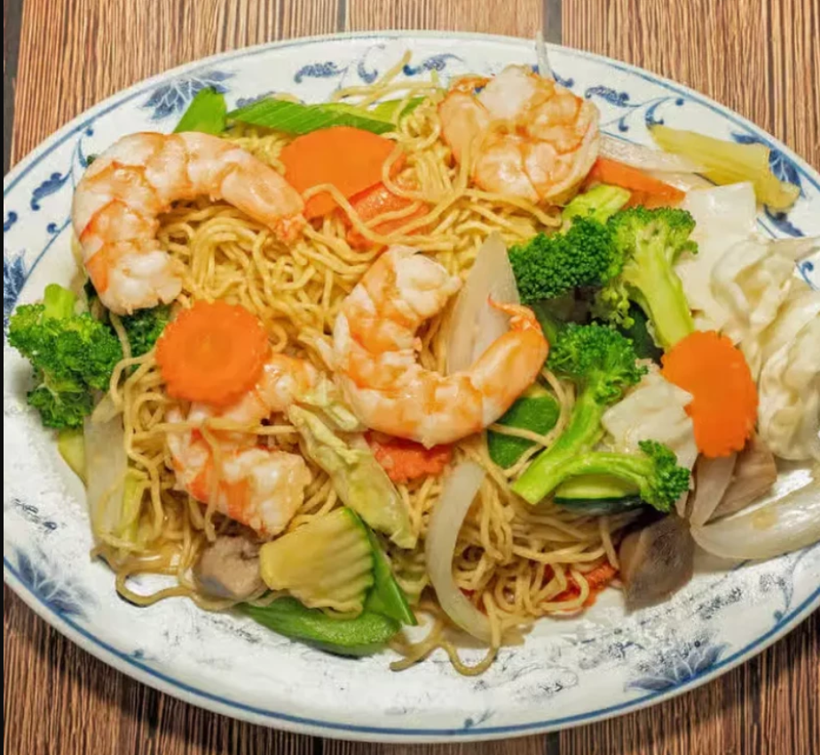 Stir-Fried Chow Mein Noodle With Prawns, Broccoli, Cabbage, Carrot...
